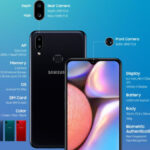 ابعاد سامسونگ گلکسی آ۱۰ ۱۵۶٫۹۰ * ۷۵٫۸۰ * ۷٫۸۰ mm و وزن آن ۱۶۸گرم است. این گوشی در رنگهای مشکی، آبی و سبز ارائه شده است.